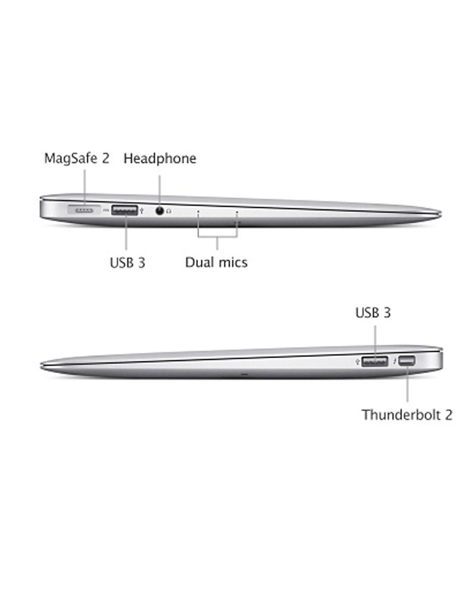 Với cổng kết nối Thunderbolt 2 cung cấp tốc độ nhanh gấp 2 lần so với thế hệ trước, bạn có thể kết nối với Macbook Air với các thiết bị và màn hình mới nhất giống như Apple Thunderbolt Display. Đồng thời với 2 cổng kết nối USB 3.0 bạn có thể kết nối với các thiết bị mới nhất và cũng tương thích ngược với kết nối USB 2.0. Tuy chỉ với một vài kết nối nhưng Macbook Air đã chuyển từ một chiếc máy notebook thành máy trạm hoàn hảo.